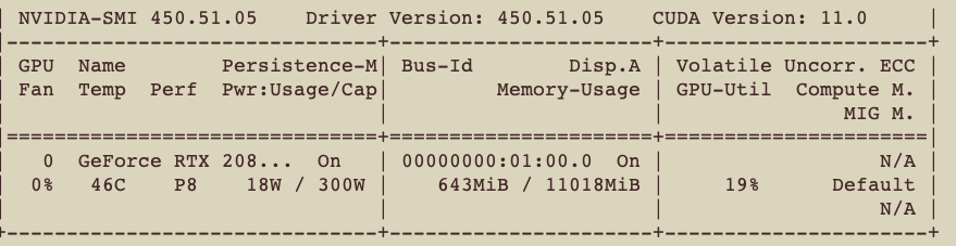 nvidia-driver 같은 경우 nvidia-smi command 를 사용하면 확인이 가능하다.