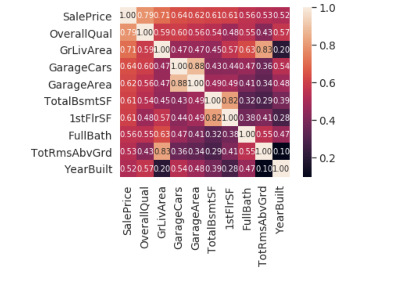 cols = corrmat.nlargest(k, 'SalePrice')['SalePrice'].index