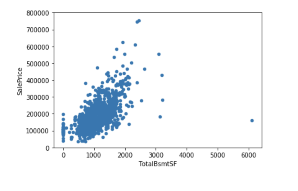 확실히 totalBsmtSF는 GrLivArea에 비해서는 상관관계가 없어 보입니다.
