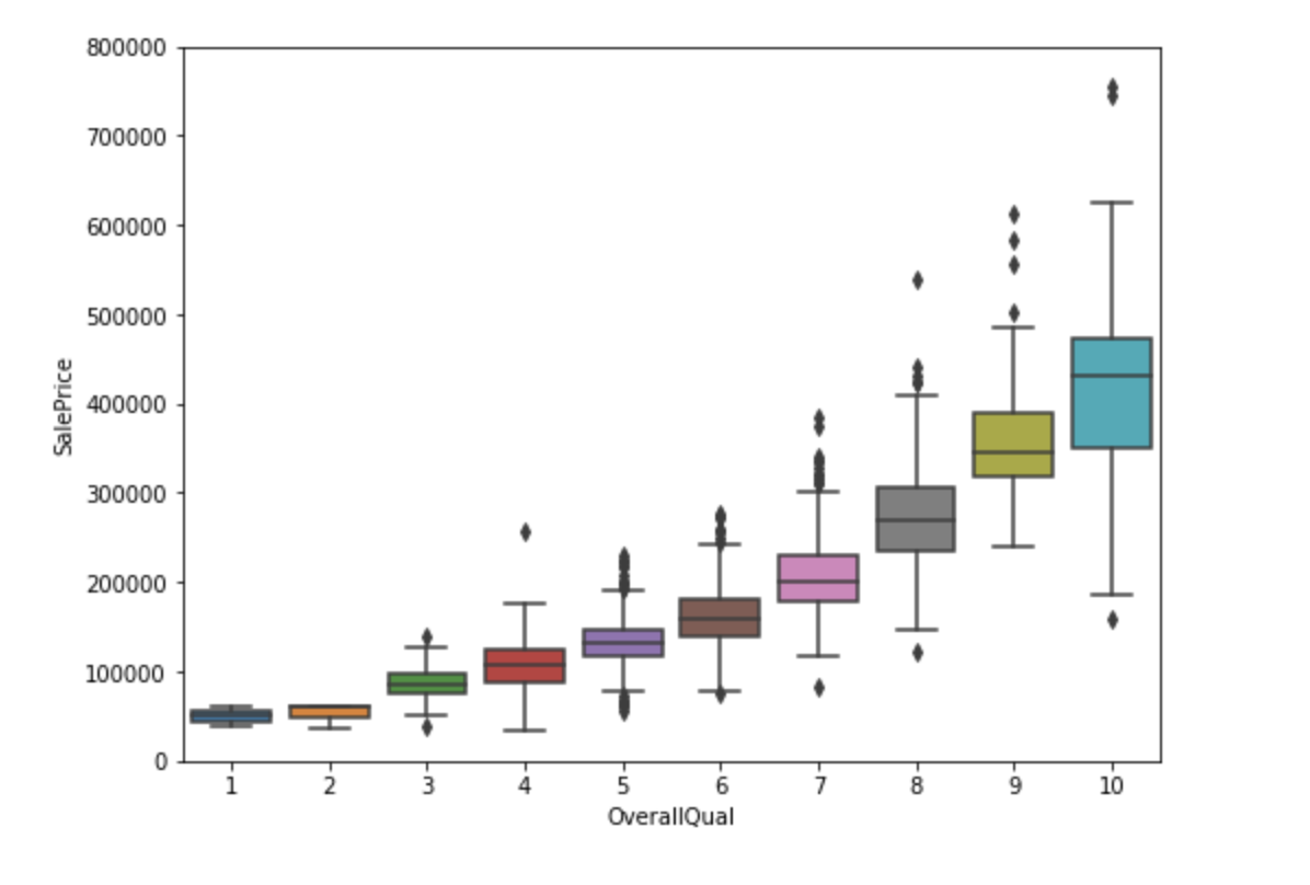그럼 OverallQual은 어떨까요? 1~10 의 categorical value 이기 때문에 box plot으로 visualization이 가능합니다.