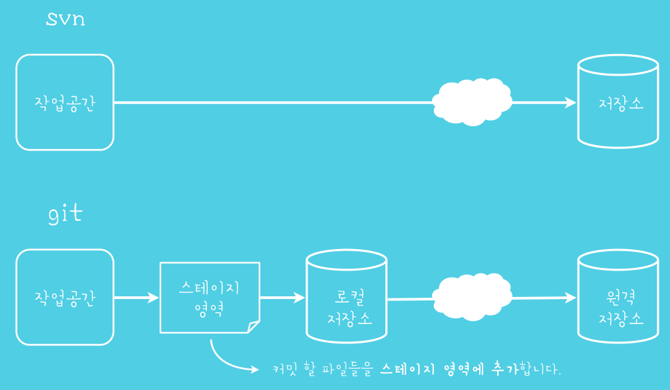 - Git 에는 SVN과는 달리 staging area라는 게 있어서, commit을 하기 전에 담아두는 공간이 있습니다.