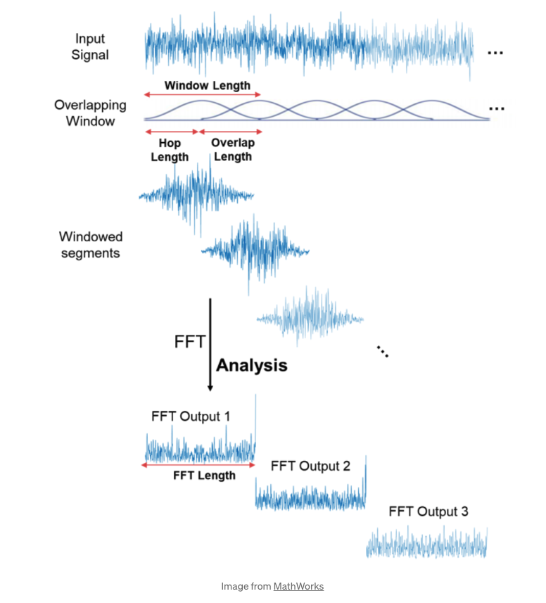n_fft 와 hop_length의 경우에는, 한 번의 STFT를 적용하는 길이(window length) 를 말합니다. 또, hop_length는, 각각의 window 사이의 길이를 뜻합니다. 아래 그림에서 확인할 수 있습니다. 만일 hop_length가 n_fft보다 긴 경우에는, padding이 필요할 수 있습니다.