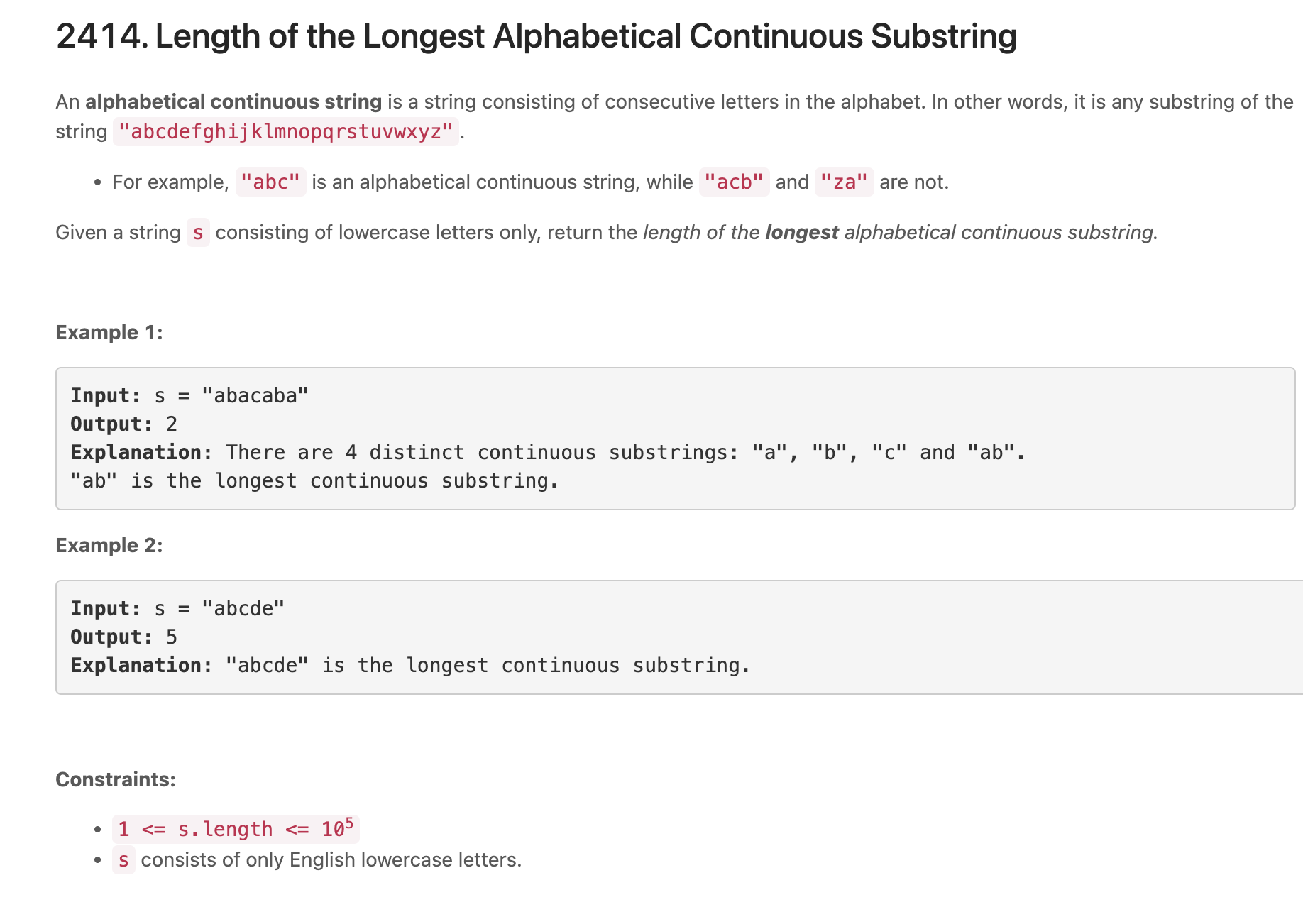 def longestContinuousSubstring(self, s: str) -> int: