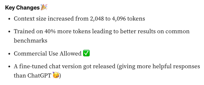 context size가 커진 것, 훈련에 사용된 데이터가 40% 늘어난 점, 상업적 사용이 가능한 점 이외에, 가장 중요한 점은, Fine-tune할 수 있는 Chat version이 생긴 점입니다.