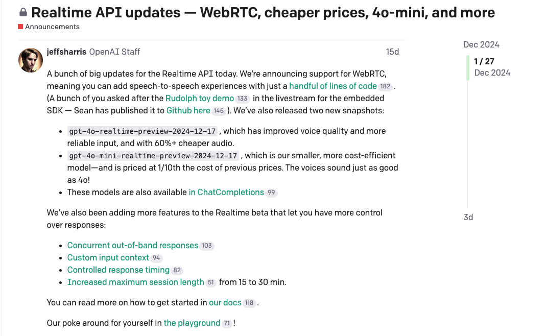 한마디로, 채팅 어플에는 websocket을 쓰고, webRTC로는 비디오나 오디오통신을 쓰라고 합니다. webSocket은 tcp 형식이라서, low-latency 통신은 잘 못한다고 하는군요. openai에서 기존의 가격의 10분의 1로 싸게 내놨다고 하니깐, 사용하는것이 기존보다는? 싸질 것이라고 생각합니다. 그래도 scaling은 쉽지 않겠지만요.
