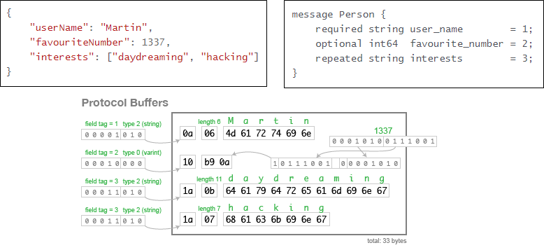Protocol Buff 는 Google 에서 개발한 Serialization method 입니다. 아래 그림과 같이, JSON 에서는 82 Byte를 사용해야 하는데 비해, Protocol Buff 는 필드 번호, 필드 유형을 1 Byte로 표현하기 때문에, 33 Byte로도 표현할 수 있습니다.