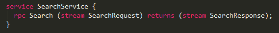 Service 는 서버가 클라이언트에 제공할 함수의 형태를 정의합니다. 서비스명과 메소드명은 모두 CamelCase를 권장합니다. 옵션을 주지 않으면 단일 요청/응답으로 동작하지만, stream 옵션을 주면 RPC를 구현할 수 있습니다.